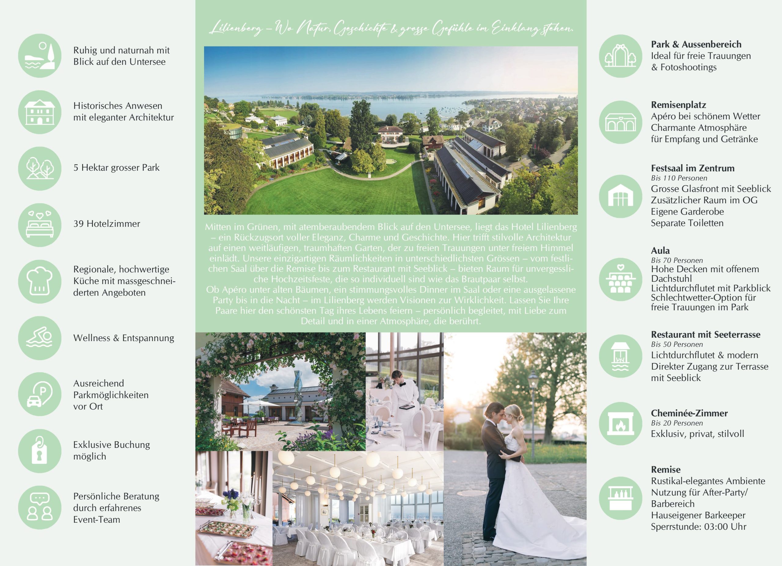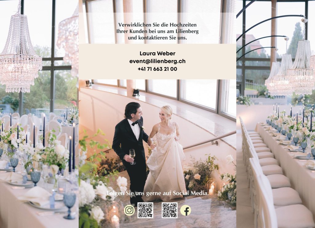 Gemäss unserer «Bankettmappe» und der Broschüre «Heiraten auf Lilienberg».