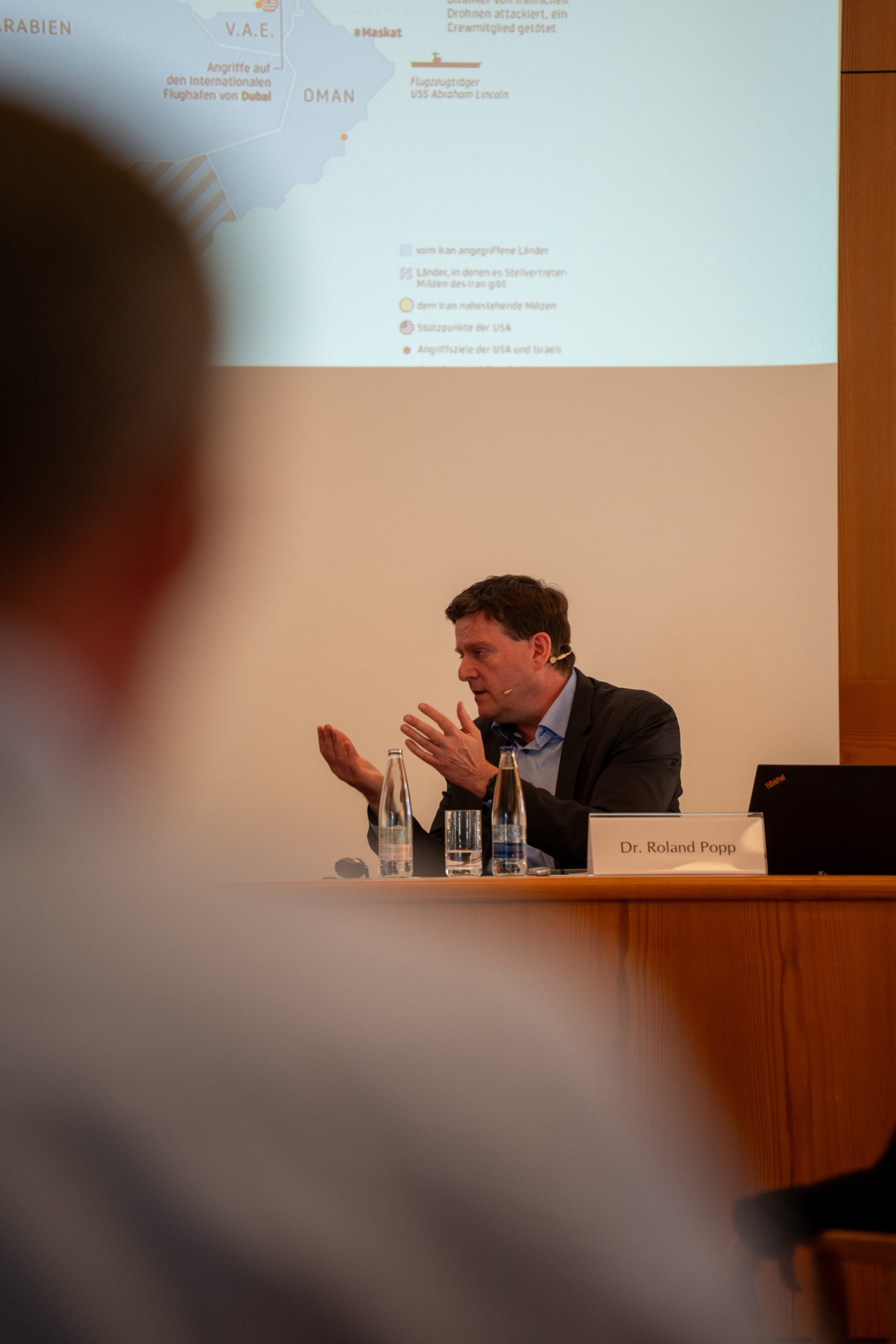 Als Gastreferent konnte kurzfristig Dr. Roland Popp, Forscher an der Militärakademie der ETH Zürich und ausgewiesener Nahostexperte, gewonnen werden. Er überzeugte mit einem äusserst professionellen Auftritt und einer klar strukturierten, einleuchtenden Analyse der aktuellen Entwicklungen. In seinen Ausführungen gelang es ihm, die komplexen geopolitischen Zusammenhänge verständlich darzustellen und verschiedene mögliche Szenarien differenziert zu beleuchten.